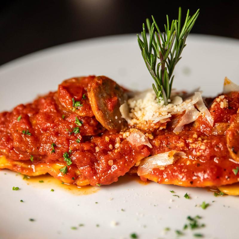Meat stuffed ravioli with Italian sausage in a marinara sauce