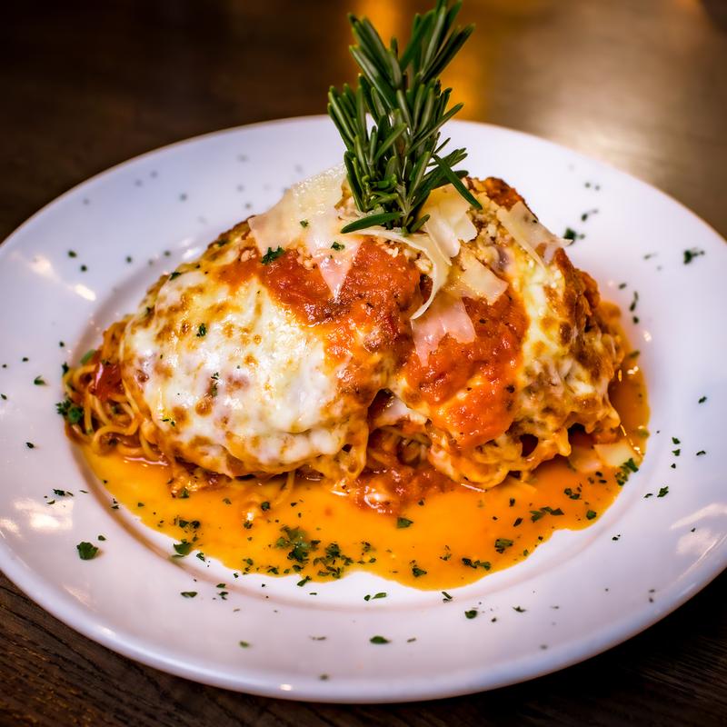 Chicken breast, lightly breaded in Italian seasoning with melted mozzarella and spaghetti pasta