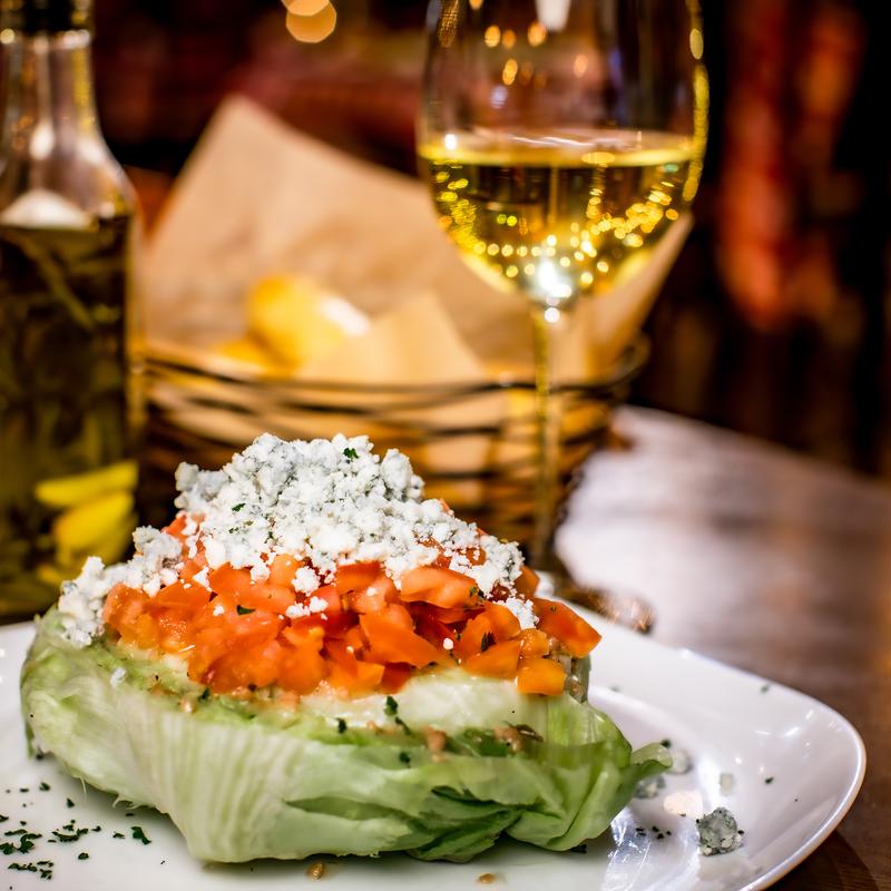 Crispy Iceberg lettuce with gorgonzola, tomato and house Italian dressing with house bread sticks