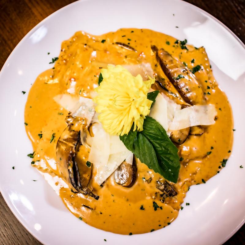 Four portobello mushroom stuffed ravioli in a butter brandy sauce