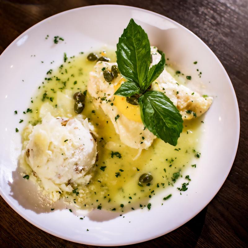 Lightly breaded and sauteed tilapia with capers in a white wine lemon butter sauce, served with house vegetables and mashed potatoes or penne alla vodka