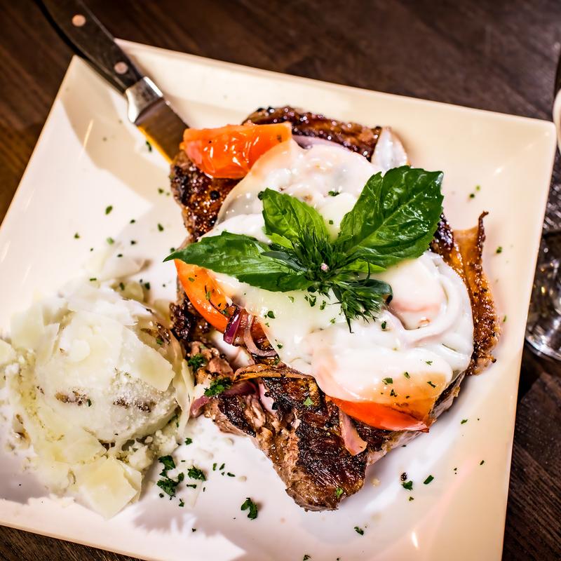 16oz Ribeye Steak topped with tomato, onion, garlic and melted Mozzarella