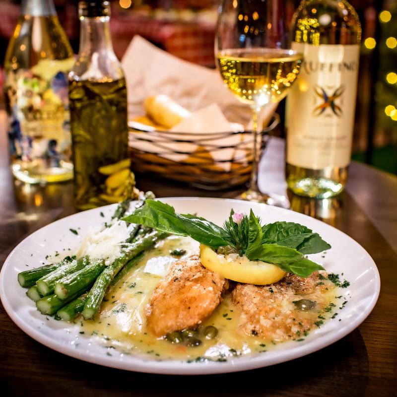 Chicken lightly breaded with a lemon, butter and white wine sauce with capellini pasta